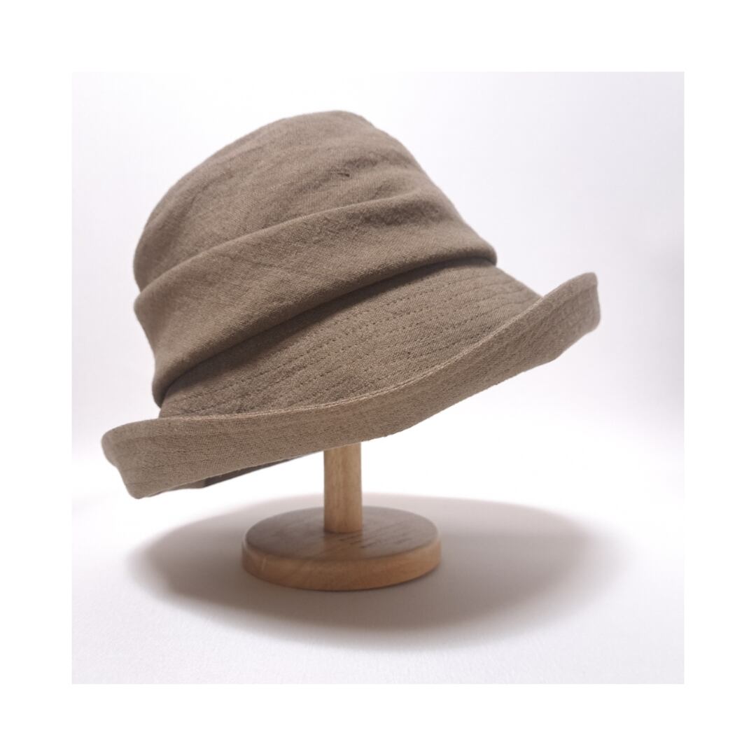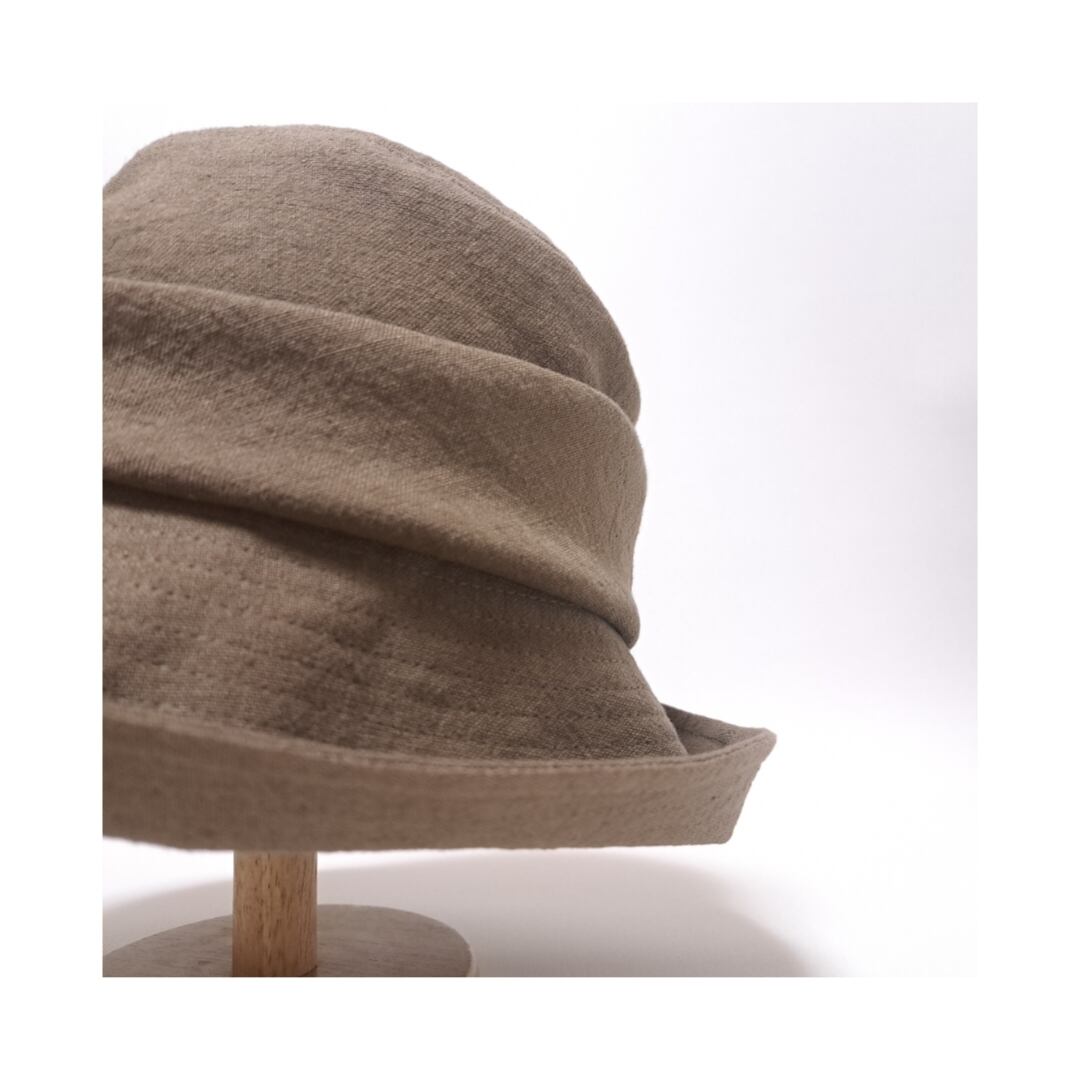 洗いこまれた柔らかな風合いの綿麻オックスで作った「傾く夏の帽子。」 はクラウン後部に大きなタックをとって後ろ側へ傾いているようなデザインの帽子。つば幅は少し広めの9.5㎝くらい、つばを下ろしていると視界を覆い隠すほどだから夏の熱い日差しもしっかりガードしてくれてこれからの季節にとても重宝します。裏地は夏にぴったりの通気性、吸汗性にも優れた薄手の綿100%生地を使用。サイズリボン裏のマジックテープで57.5cm~56cmまでのサイズ調節が可能です。