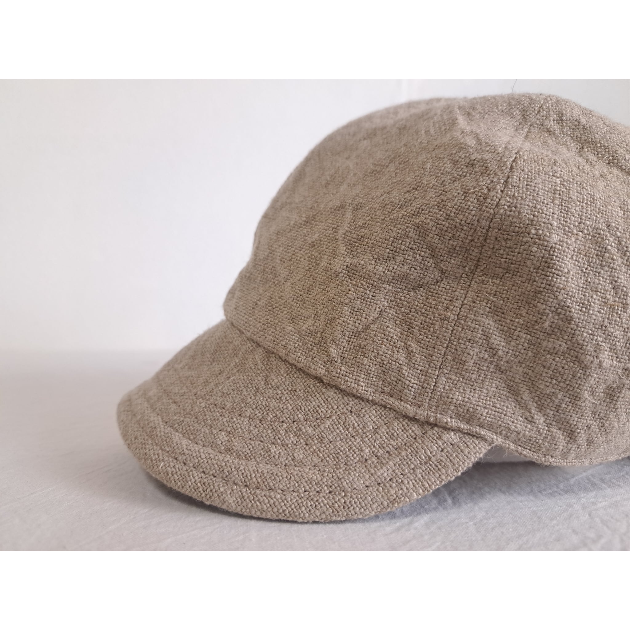 イタリア製リネンの8番糸と太番手の生成り糸を平織りに織り上げ、タンブラー加工でやわらかく仕上げた、ロングセラー生地を使ったキャップです。ざっくりとした厚みのある生地のポコポコとした質感と、ふうせんのような丸みのあるシルエットが愛らしい一枚。つば裏のみチャコールグレーをさりげなく添えました。伸縮性のあるゴム製のサイズ調整ひもで56〜58cmに対応。芯なしのつばはコンパクトに折り畳めるので、お散歩にも旅にも気軽に連れ出せます。洗うたびに育っていく風合いを、どうぞ長くお楽しみください。