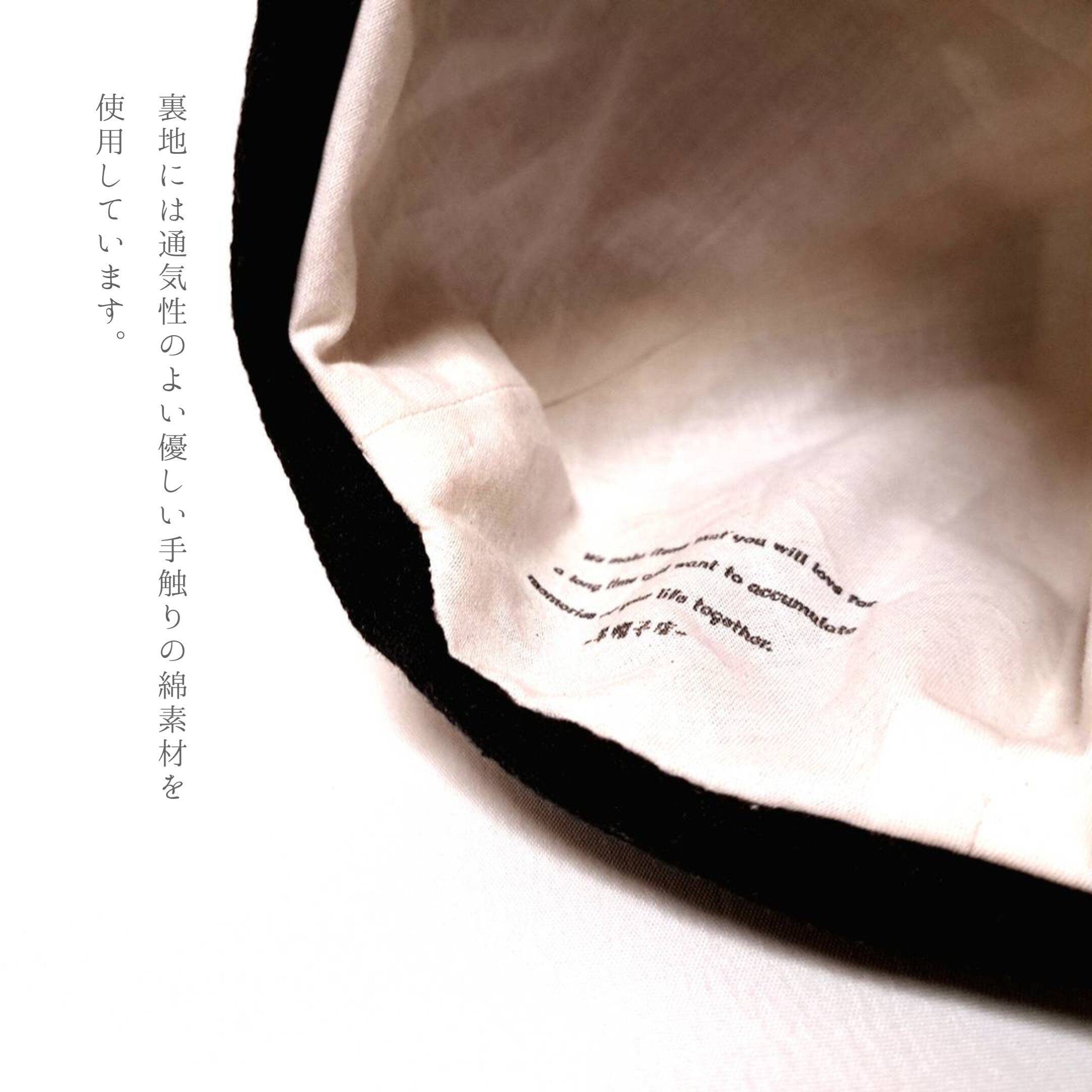 「コトリネ」はコットンリネンの略で、毎回使用するコットンリネン生地によって綿と麻の混紡率が違っていたりします。繊維の混紡率や使用する糸の太さ、織り方によっても生地の風合いは随分違ってくるコットンリネン、今回コトリネベレー帽に使用しているコットンリネンはコットン75%リネン25%とやや綿の混紡率が高めのもの、やわらかでいて、さっぱりとした綿の触感と麻のしっかりとしたコシをお楽しみいただけると思います。