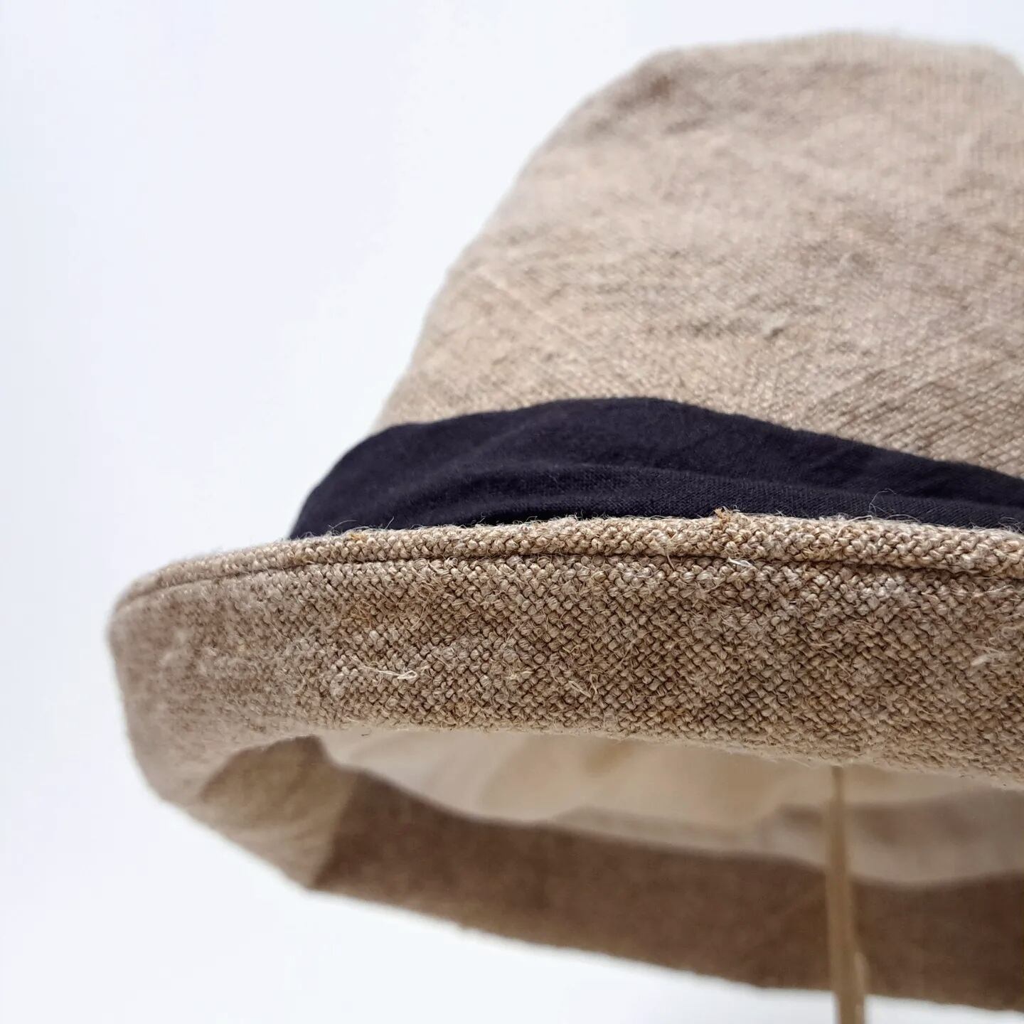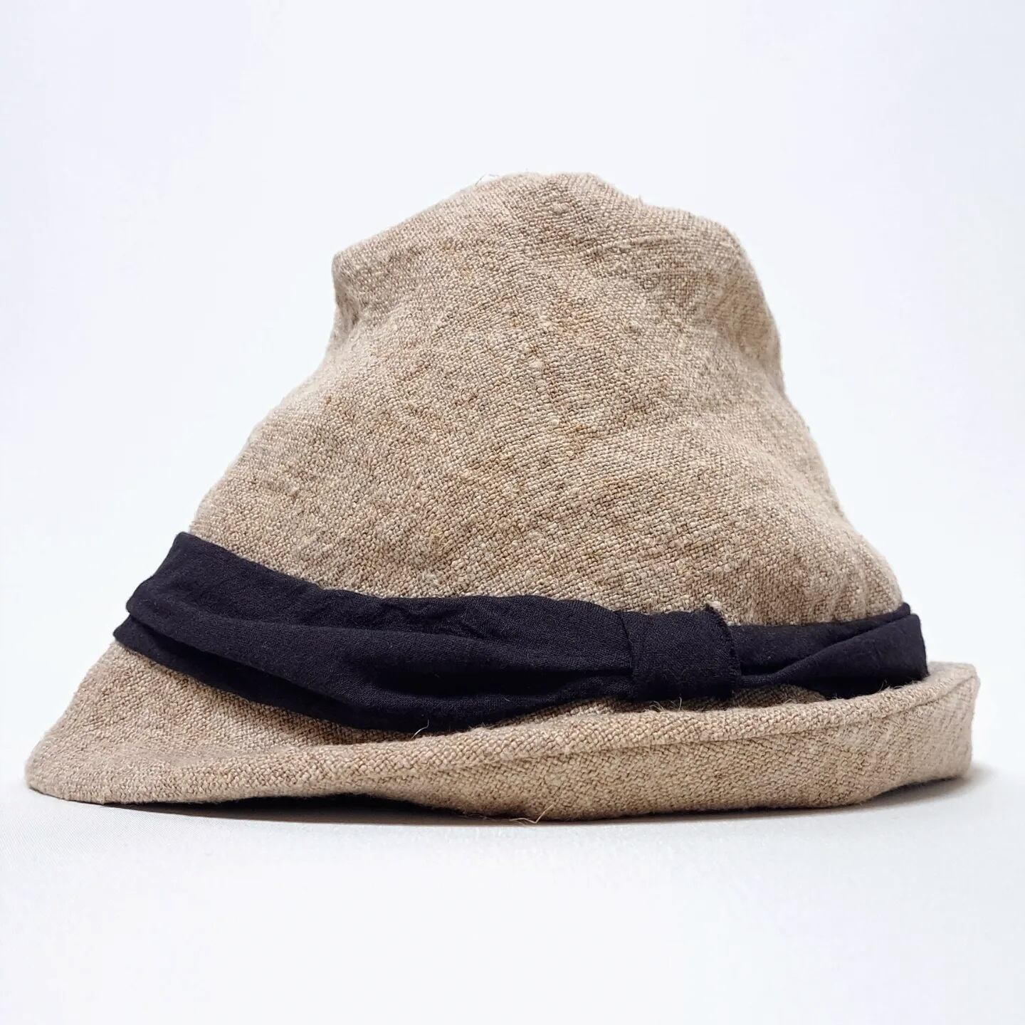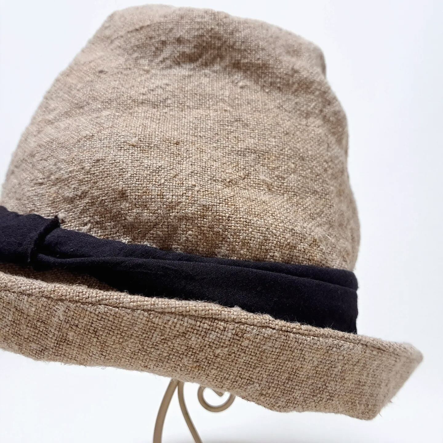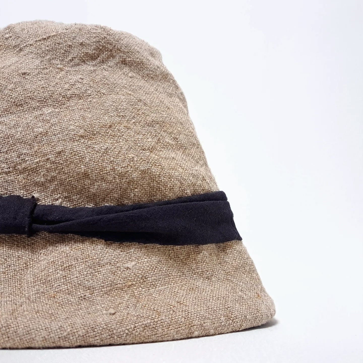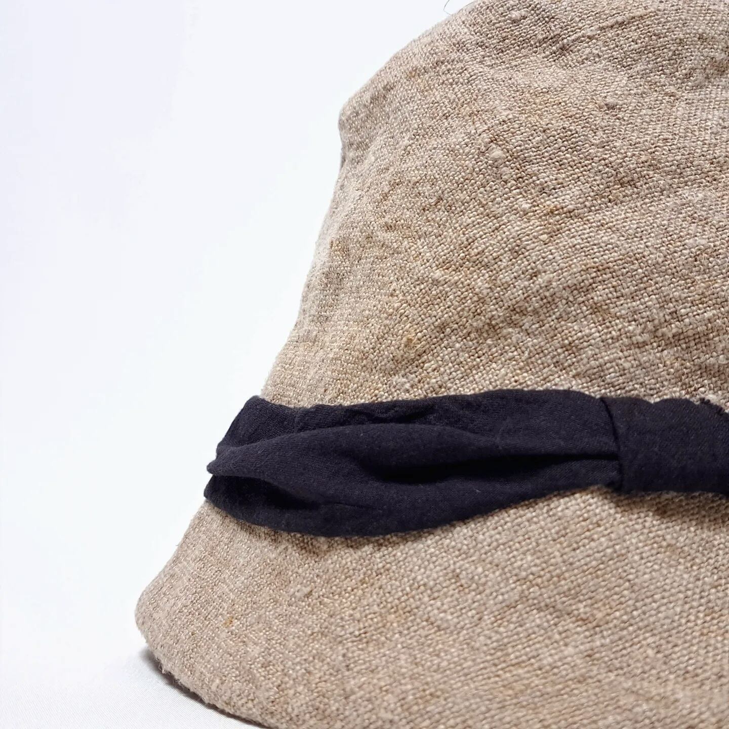 イタリア製リネンの8番と太番手の生成り糸を使い織りあげたざっくりとした平織生地で作った素朴な風合いのマウンテンハットです。ツバを上げたり下ろしたり、スタイルに合わせてお好みでお楽しみいただけます。