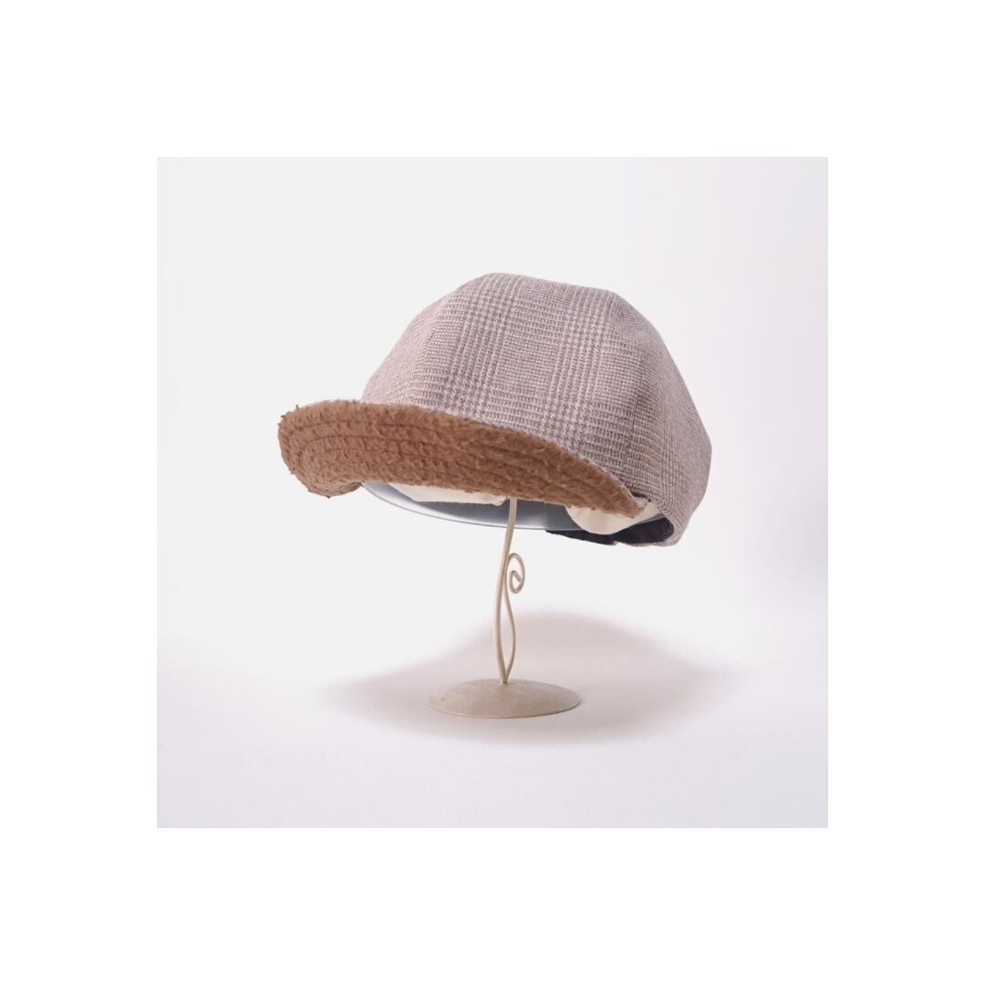 カクカクと四角い印象のグレンチェック柄の薄手のウール100%生地を使って、まぁるくてやわらかなフォルムの冬のプルアップキャップを作りました。つば裏にはブレンドウール生地を合わせて少しお洒落なツートーン仕立てにしています。